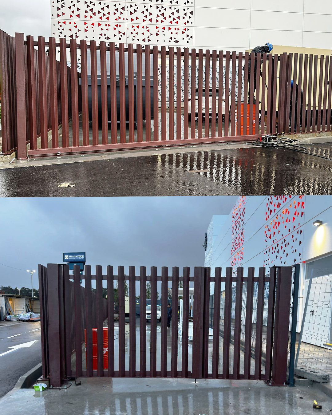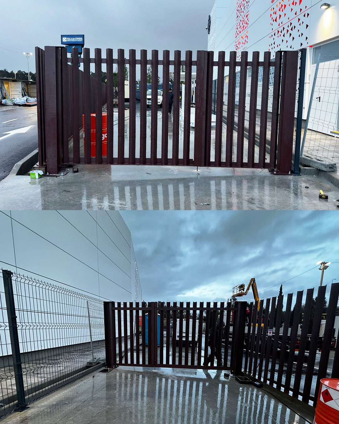 Os portões foram concebidos à medida, com uma estrutura robusta em aço e um design moderno de lâminas verticais, garantindo controlo de acessos eficiente e elevada resistência ao uso intensivo e às condições exteriores.