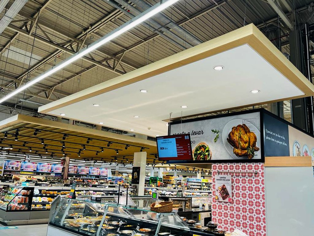 Execução de tetos suspensos em espaço comercial, desenvolvidos para o cliente Continente, com foco na funcionalidade, estética e integração técnica.